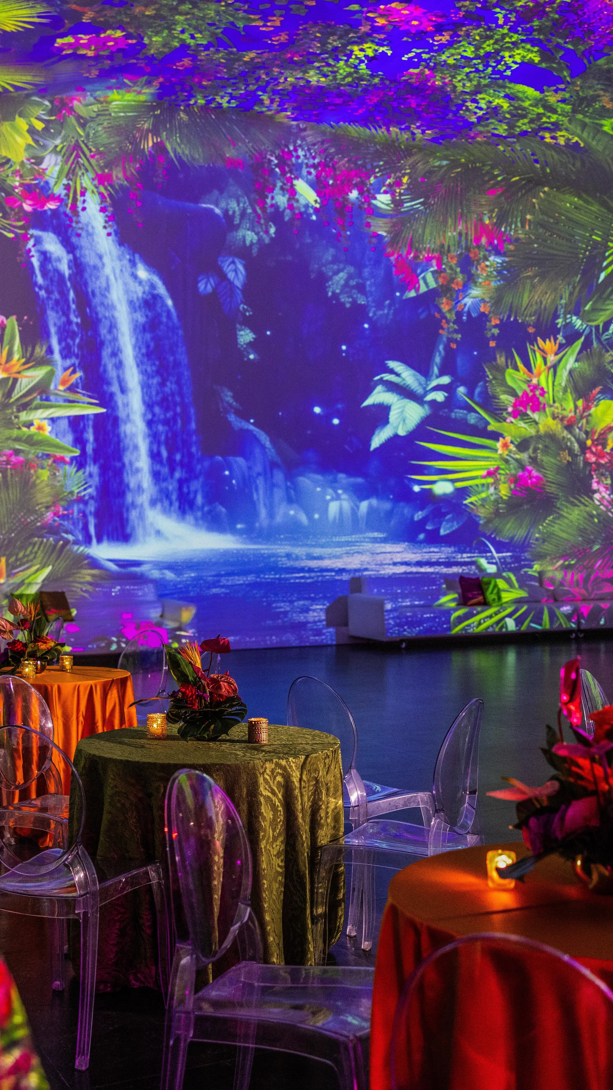 The Temple House expert 360-degree permanent projection mapping system elevates our events to a new level. With this technology, we can create virtually any ambiance, atmosphere and any experience. Enjoy a fully immersive environment surrounded by a lush flower garden, visit any city in the world, take an underwater excursion or float in to outer space. Clients and guests can customize the visual show to whatever their theme or objective is - the possibilities are truly endless, and allows for some of the most dynamic and extraordinary events to come to life. The best way to learn more is to browse thru our image gallery and contact us for more details!